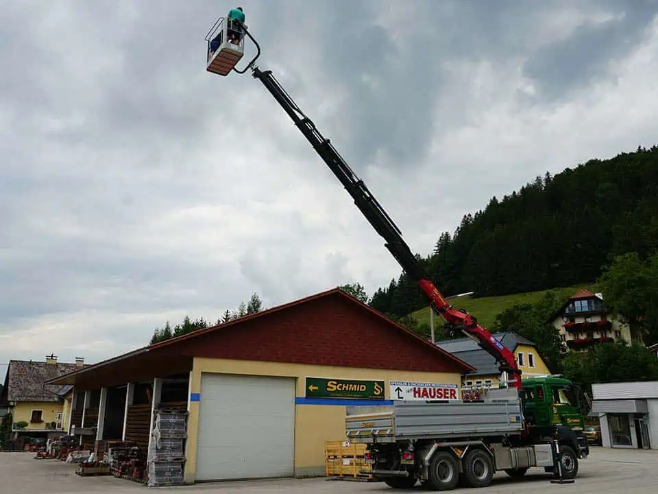 Ob mit Arbeitskorb oder Lasthaken, gerne unterstützen wir Ihr Bauvorhaben mit unseren modernen Kran-LKW.