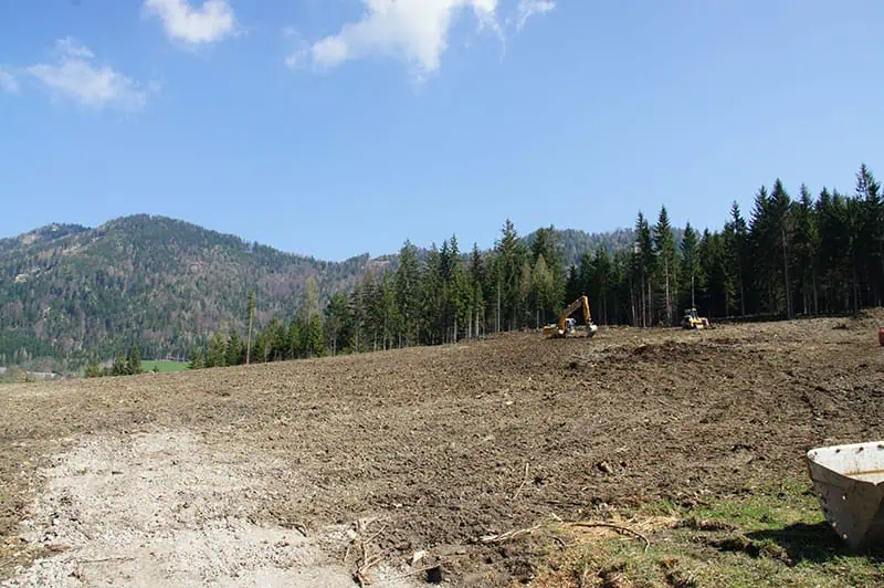 Für die geplante Flächennutzung wurde eine größere Waldfläche professionell gerodet und von Bäumen, Wurzeln und Gehölz befreit.